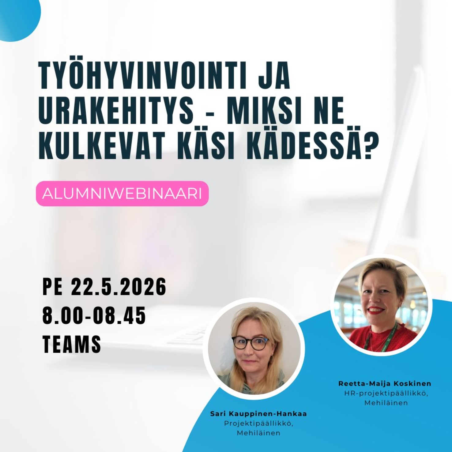 Tässä webinaarissa kuulemme kaksi erilaista uratarinaa. Mehiläisen projektipäällikkö Sari Kauppinen-Hankaa ja HR-projektipäällikkö Reetta-Maija Koskinen kertovat, miten työhyvinvointi on ollut keskeinen tekijä urakehityksen eri vaiheissa, opiskelusta johtotehtäviin ja alanvaihdon kautta uusiin rooleihin. Sari ja Reetta-Maija jakavat ajatuksiaan siitä, millainen organisaatiokulttuuri tukee työntekijöiden kasvua ja hyvinvointia.