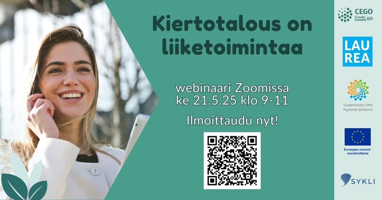 Kiertotalous on liiketoimintaa -webinaari pidetään ke 21.5.2025 klo 9-11. Lue lisää ohjelmasta CEGO - Circular Economy GO -hankkeen sivuilta.