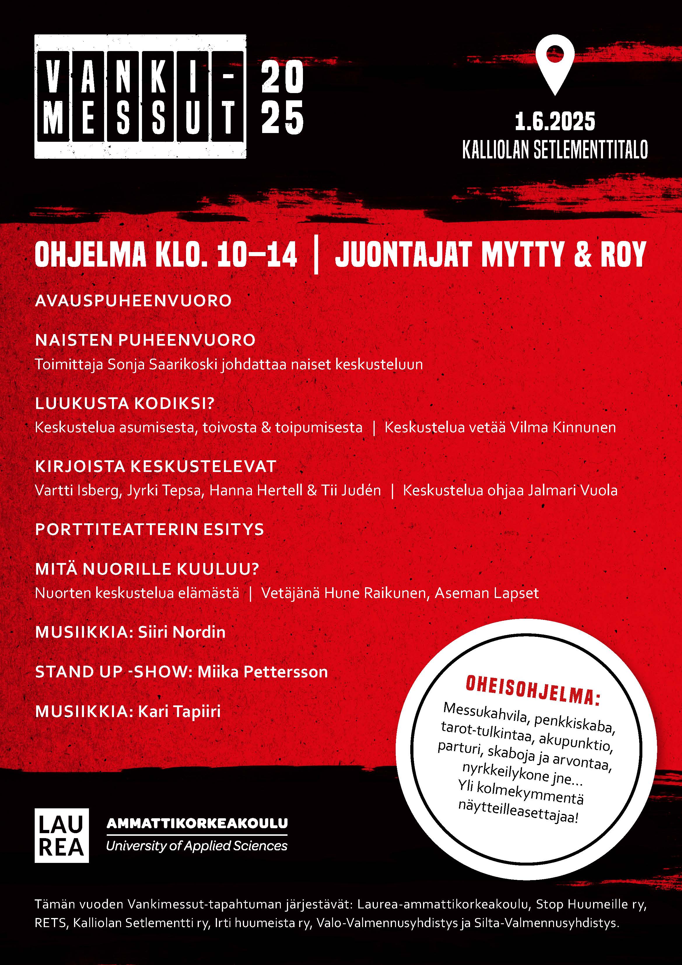 Vankimessut 2025 -tapahtuma järjestetään 1.6.2024 klo. 10-14 Kalliolan Setlementtitalossa Helsingissä.