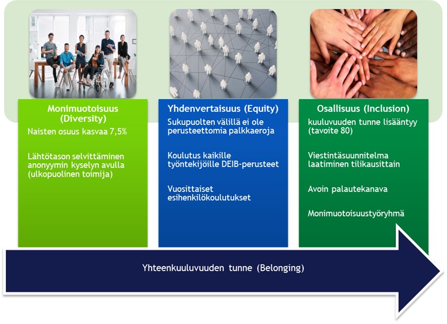 Osallisuustavoitteet: Yrityksen tavoitteena on luoda työpaikka, jossa jokainen työntekijä voi tuntea olevansa osa yritystä. Tavoitteena on nostaa kuuluvuuden tunne tasolle 80 vuoteen 2027 mennessä, ja tätä mitataan vuosittaisilla henkilöstökyselyillä. Viestintäsuunnitelma päivitetään tilikausittain, ja siinä huomioidaan eri vähemmistöryhmien ja tärkeiden päivien viestintätarpeet, yhteistyössä viestintäpäällikön ja monimuotoisuustyöryhmän kanssa. Lisäksi yritys avaa palautekanavan intraan, jotta työntekijät voivat antaa palautetta ja kehitysehdotuksia monimuotoisuustyöhön. Monimuotoisuustyöryhmä jatkaa toimintaansa seuraavat kolme vuotta, ja sen jäsenet valitaan vuosittain eri puolilta organisaatiota.