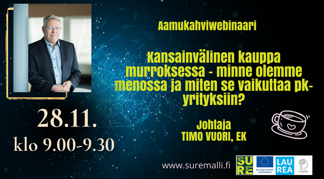 Aamukahviwebinaarissa aiheena "Kansainvälinen kauppa murroksessa - minne olemme menossa ja miten se vaikuttaa pk-yrityksiin".