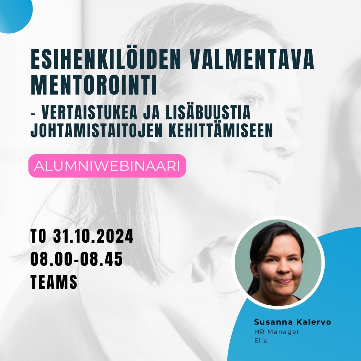 Tässä webinaarissa Susanna kertoo käytännön esimerkkejä siitä, miten esihenkilöiden valmentavasta mentoroinnista saadaan lisätukea sekä omien johtamistaitojen kehittämiseen että työssäjaksamiseen. Juho Rasmus on Elis Suomen tuote- ja markkinointipäällikkö. Juho on ollut osana Eliksen myyntitiimiä vuodesta 2013 lähtien ja hän on osallistunut yrityksen sisäiseen mentorointiin. Webinaarissa kuullaan Juhon kokemuksia siitä, miten mentorointi on toiminut arjessa ja millaisia positiivisia vaikutuksia sillä on ollut hänen työssään.