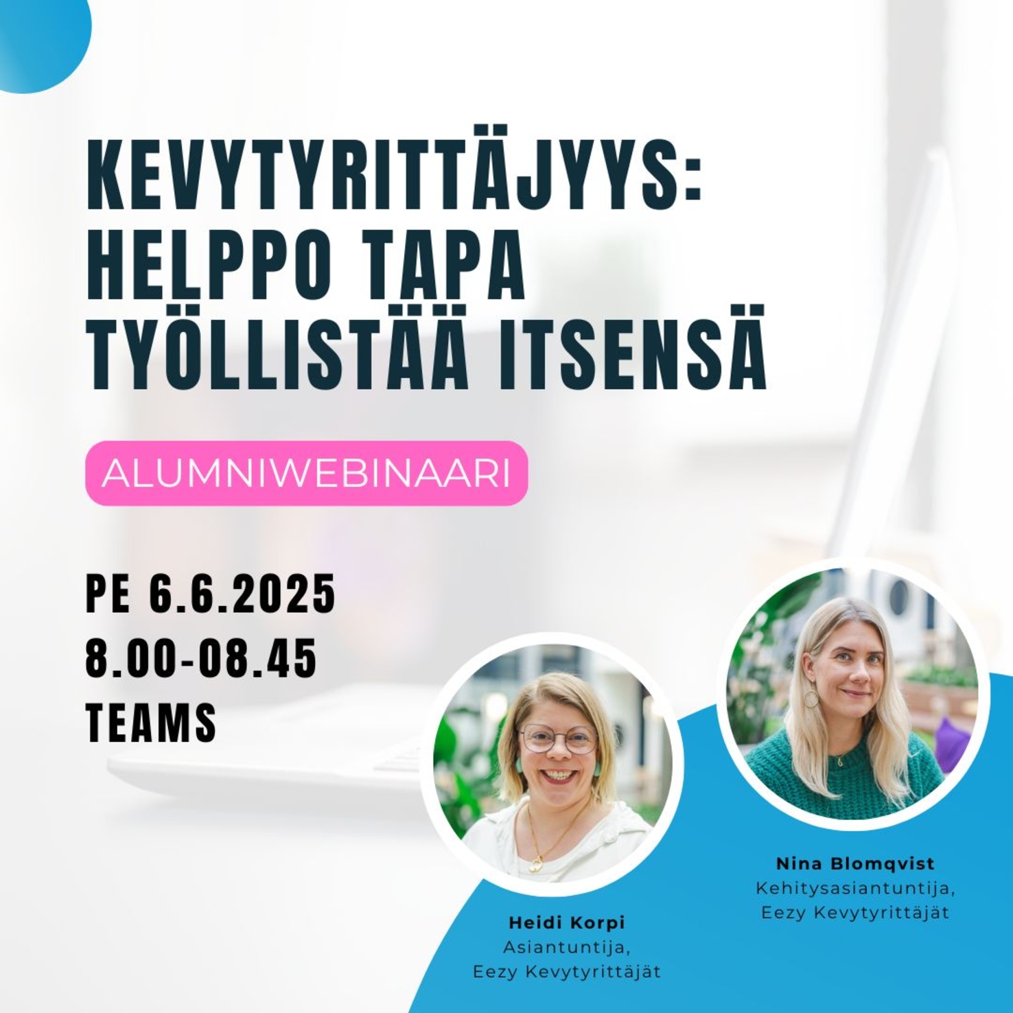 Aiheesta puhuvat Eezy Kevytyrittäjien kehitysasiantuntija ja Laurean alumni Nina Blomqvist ja asiantuntija Heidi Korpi. Nina kehittää palveluita yhdessä kevytyrittäjien kanssa ja Heidi auttaa kevytyrittäjiä erilaisissa kysymyksissä toimien itse myös kevytyrittäjänä palkkatöiden ohessa. Webinaarissa käsitellään kevytyrittäjänä aloittamista ja Heidin omia kokemuksia sekä vinkkejä kevytyrittäjyydestä.