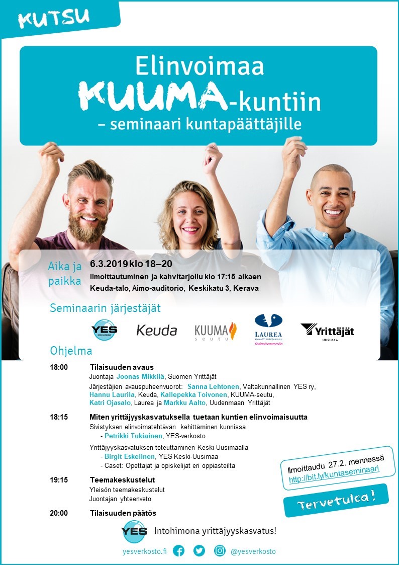YES Keski-Uusimaa ja sen toimintaa koordinoiva Keski-Uudenmaan koulutuskuntayhtymä Keuda järjestävät KUUMA-kuntien kuntapäättäjille ja alueen yrittäjille yrittäjyyskasvatuksen seminaarin, yhdessä Kuuma-seudun, Laurean ja Uudenmaan Yrittäjien kanssa. Seminaarin juontaa Joonas Mikkilä Suomen Yrittäjistä.