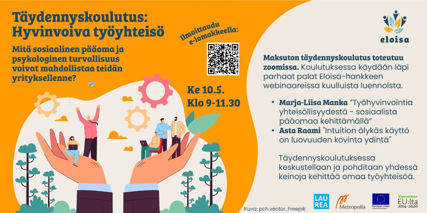 Täydennyskoulutuksessa käydään läpi parhaat palat Eloisa-hankkeen webinaareissa kuullusta Marja-Liisa Mankan luennosta ”Työhyvinvointia yhteisöllisyydestä- sosiaalista pääomaa kehittämällä” sekä Asta Raamin puheenvuorosta "Intuition älykäs käyttö on luovuuden kovinta ydintä". Täydennyskoulutuksessa keskustellaan ja pohditaan yhdessä keinoja kehittää omaa työyhteisöä.