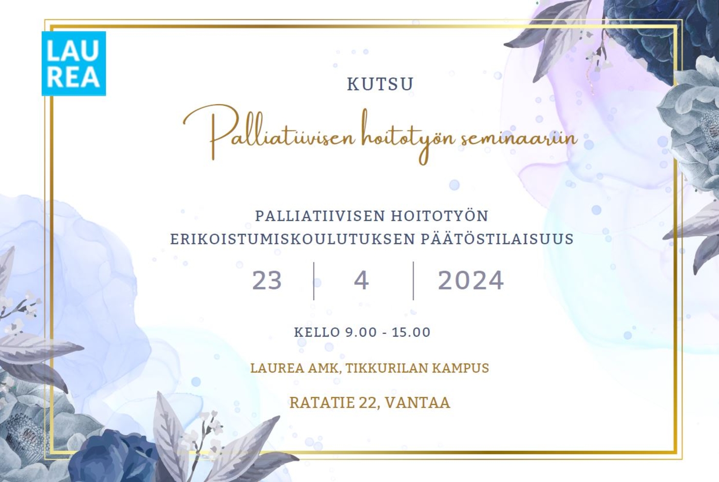 Palliatiivisen ja saattohoidon erikoistumiskoulutuksen päätöstilaisuus järjestetään 23.4.2024 klo. 9-15 Laurea Tikkurilassa (Ratatie 22, 01300 Vantaa).