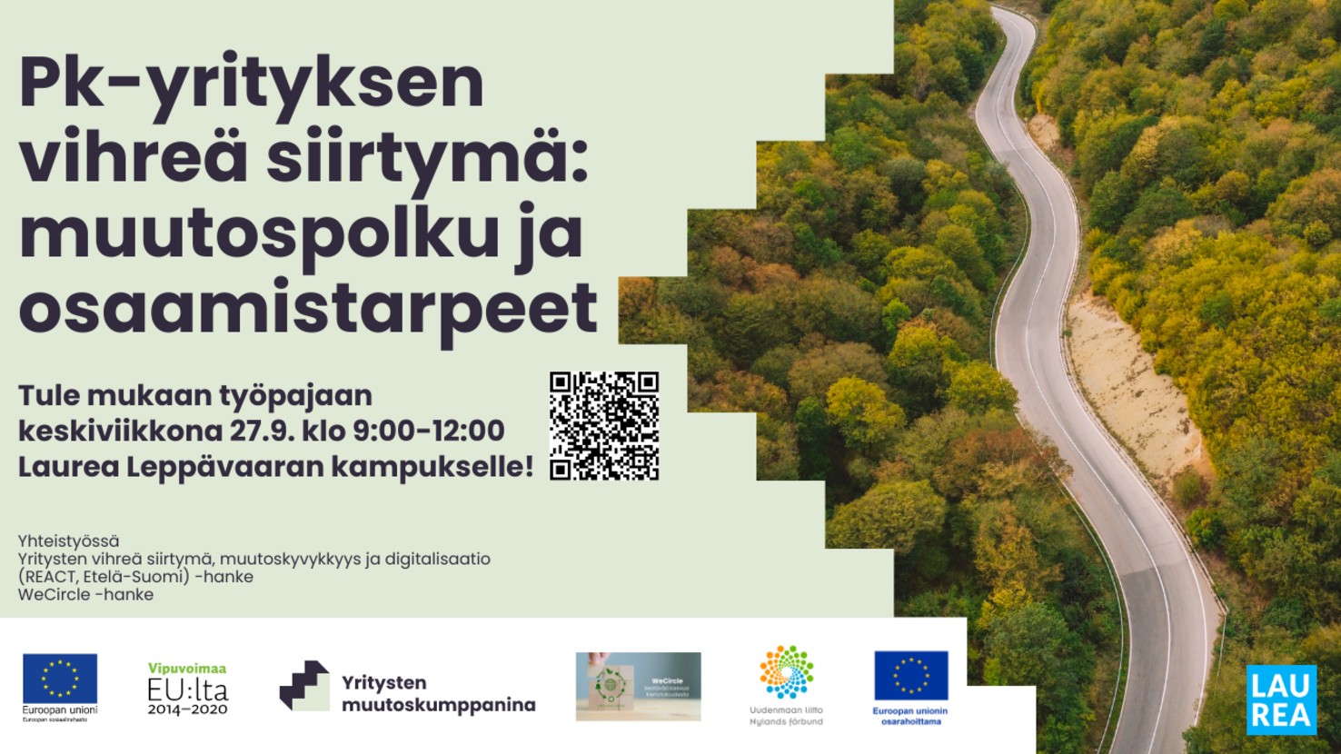 Laurea toteuttaa työpajan osana Yritysten vihreä siirtymä, muutoskyvykkyys ja digitalisaatio (REACT, Etelä-Suomi) ja WeCircle-hankkeita.
