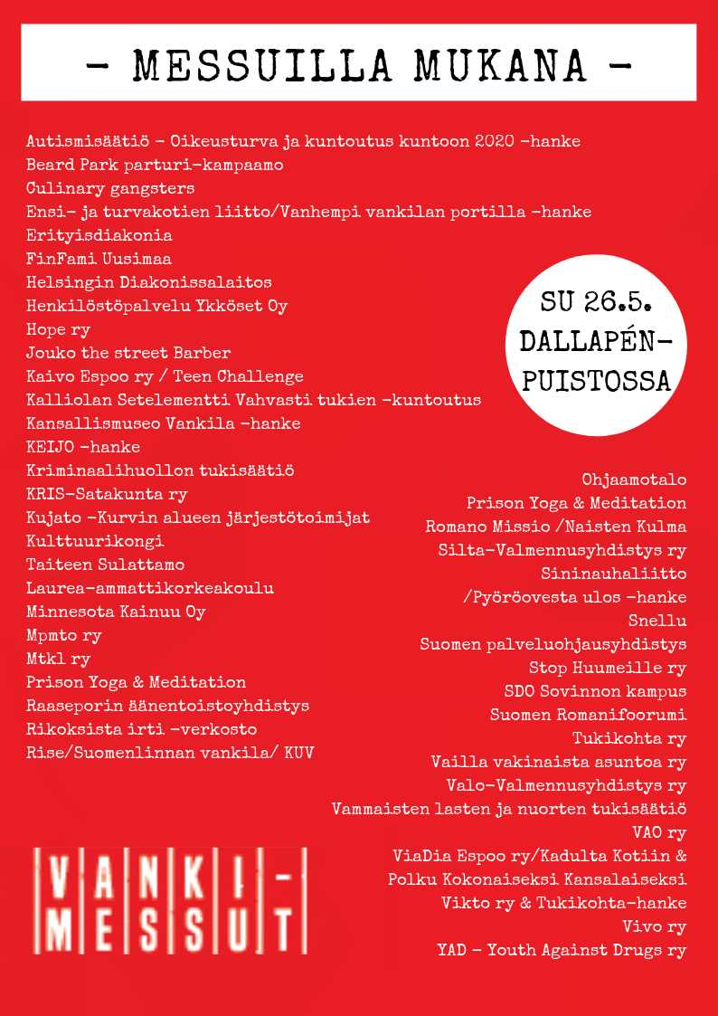 Laurea-ammattikorkeakoulu yhdessä Silta-Valmennusyhdistys ry:n, Valo-Valmennusyhdistys ry:n, Stop Huumeille ry:n, Sininauhaliiton Pyöröovesta ulos -hankkeen ja Erityisdiakonian kanssa järjestää toukokuussa Vankimessut 2019 -tapahtuman. Tapahtuma on tarkoitettu vangeille, yhdyskuntaseuraamusta suorittaville sekä heidän perheenjäsenille ja omaisille. Messujen järjestäjinä toimivat Laurean rikosseuraamusalan sosionomiopiskelijat, koulutetut kokemusasiantuntijat ja lukuisat järjestötoimijat.