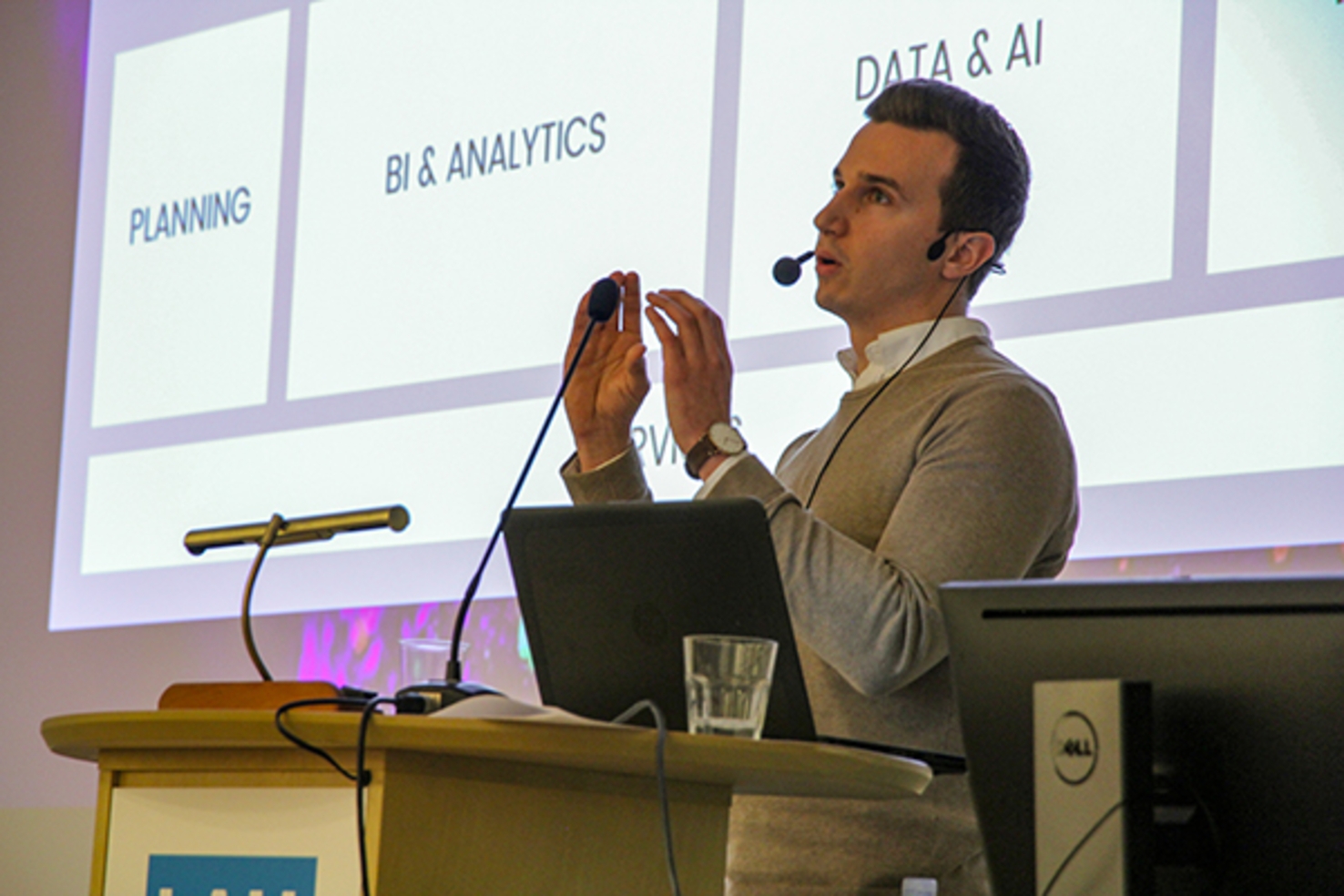 Pikaisen kahvitauon jälkeen oli Cubiq Analytics -analytiikkatalon kolmen konsultin puheenvuoro. Matias Merikallio, Henri Hassinen ja Timo Varrela osallistivat yleisön mukaan esitykseensä kyselyn muodossa: osallistujat saivat vastata Data Literacy -kyselyyn. Tämän jälkeen Merikallio kertoi lyhyesti yrityksestä ja esitteli sen asiakastarinoita dataratkaisujen näkökulmasta.