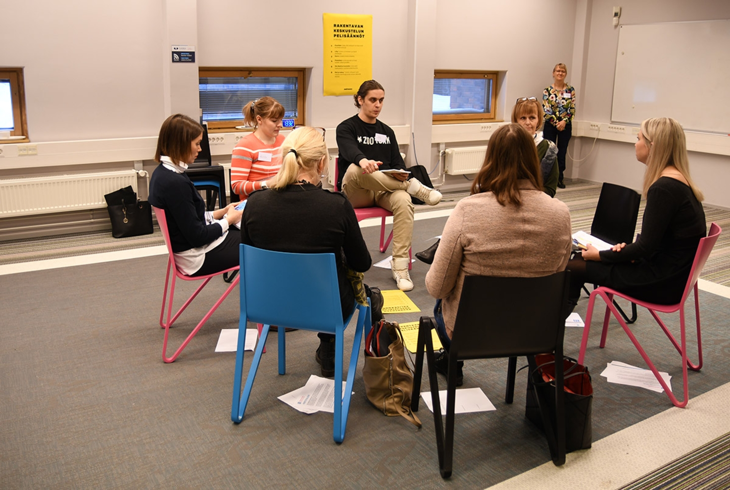 Alun yhteisen luento-osuuden jälkeen osallistujat jaettiin ryhmiin. Pienryhmäkeskusteluissa hyödynnettiin dialogi-menetelmää ja noudatettiin rakentavan keskustelun pelisääntöjä. Fasilitaattorit Sanni Tanskanen ja Ritva Jäättelä ohjasivat keskustelijoita Sitran Erätauko-koulutuksessa saatujen oppien mukaisesti. Dialogi-menetelmä sai kiitosta niin opettajilta kuin opiskelijoiltakin, ja sitä suunniteltiin hyödynnettävän myös tulevissa projekteissa.