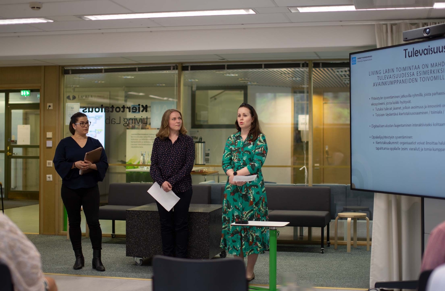 Tilaisuudessa Laurean opiskelijaryhmä esitteli, että mitä kaikkea Living Labilla on mahdollista tarjota yhteistyökumppaneille ja eri tahoille. Tarjonnassa oli mukana muun muassa täsmä- ja vertaistukiryhmiä, kiertotaloudesta informoimista ja fasilitointipaketteja. Opiskelijaryhmä myös tutki, että minkälaista tukea ja apua avainkumppanit haluavat ja tarvitsevat kiertotalouteen liittyen.