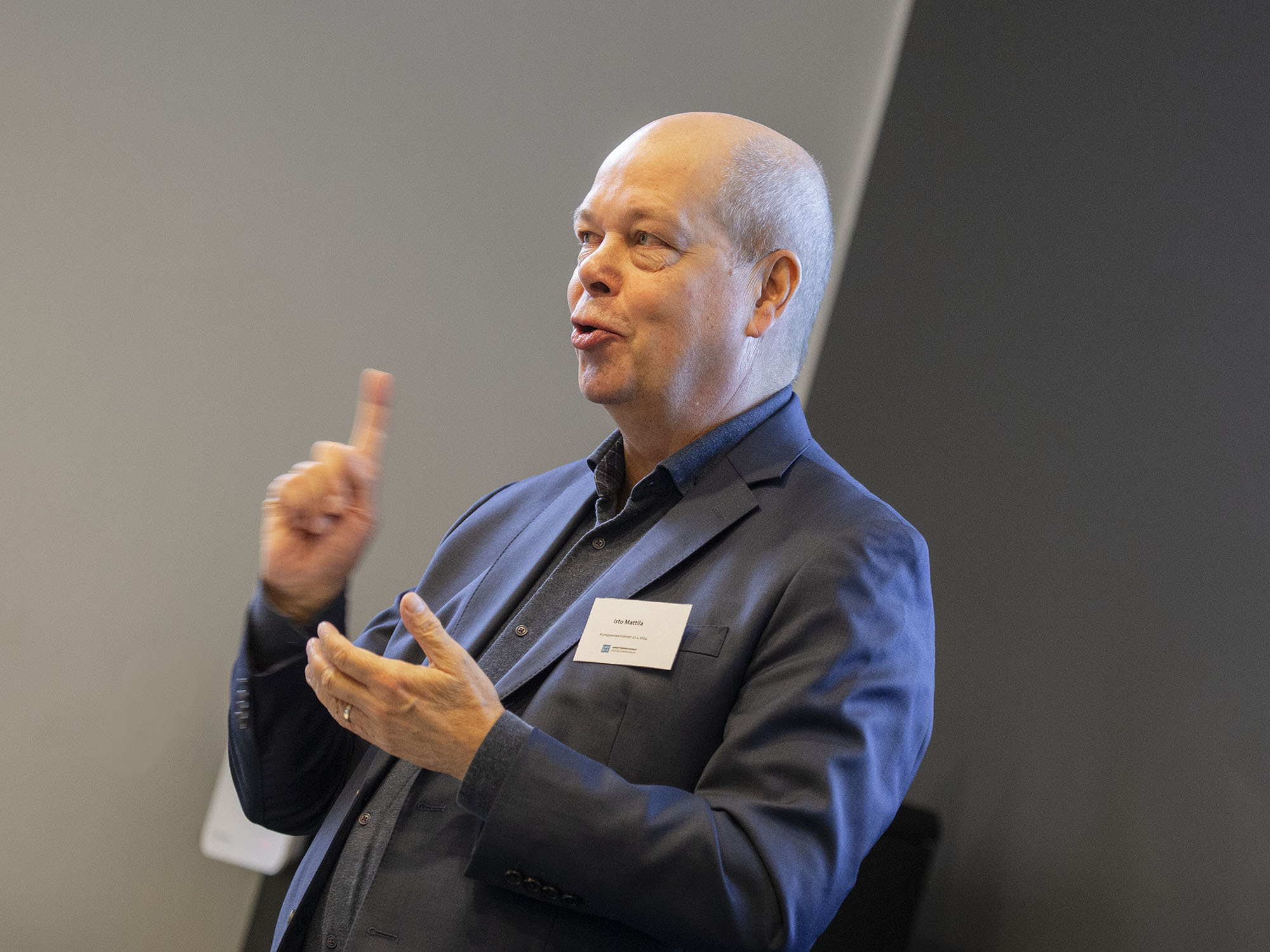 Isto Mattila toi esille Laurean turvallisuustutkimuksessa tekemää kansainvälistä TKI-työtä ja muistutti yritysyhteistyön merkittävyydestä hanketyössä. Korkeakoulussa tehtävällä tutkimuksella pyritään löytämään vastauksia hybridivaikuttamiseen, saatua tietoa viedään myös opetukseen.