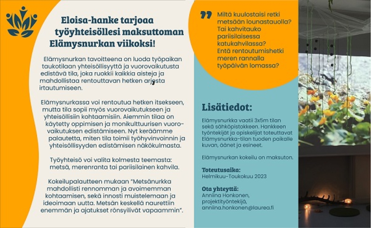 Elämysnurkasta on saatavilla kolme eri teemaa: metsänurkkaus, pariisilainen kahvila ja merenranta. Elämysnurkka rakennetaan yrityksen tiloihin noin viikon ajaksi maksutta. Tilan käyttöön opastetaan. Vastineeksi hanke kerää käyttäjäkokemuksia kokeilusta. Kokeilu voidaan toteuttaa myös Laurea Tikkurilan kampuksella, johon on erikseen tilattavissa myös kokoustarjoilut.