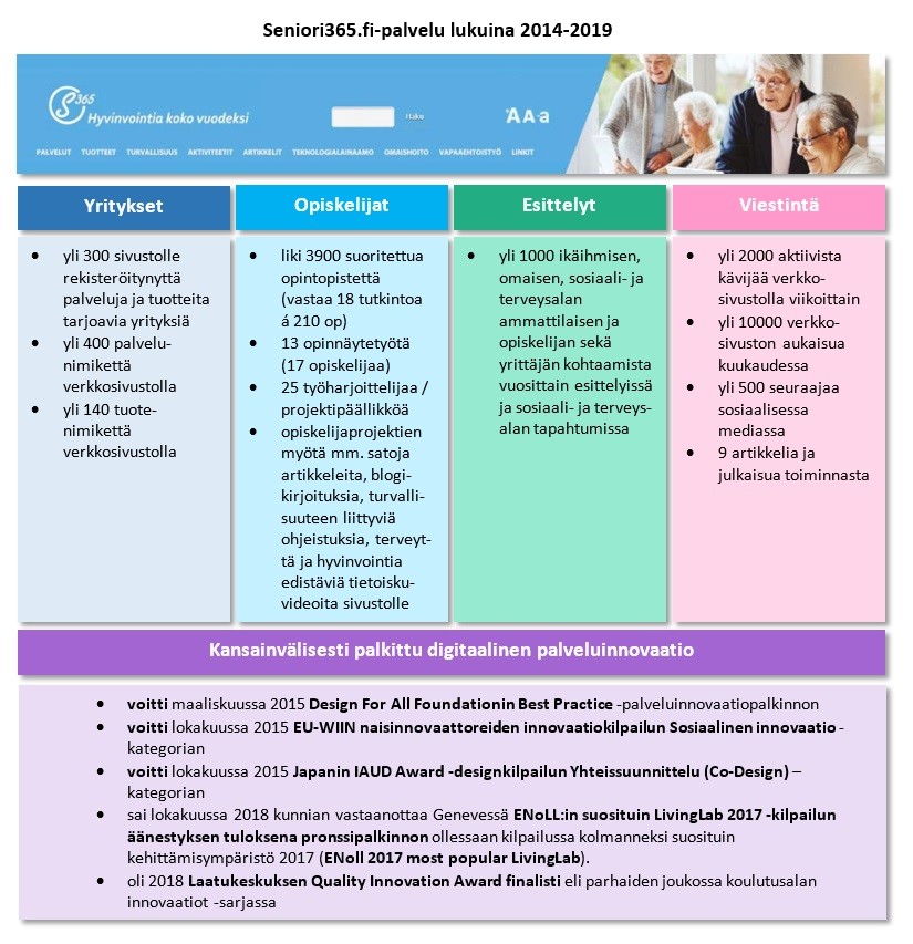 Seniori365.fi-palvelu avattiin vuonna 2014 osana InnoEspoo-hanketta, minkä jälkeen se toimi Laurean opiskelijoiden monialaisena digitaalisena oppimis- ja kehittämisympäristönä. Seniori365.fi-palvelun tavoitteena on ollut tukea ikääntyneen turvallista kotona selviytymistä, tuoda palveluja ja ratkaisuja terveyden ja hyvinvoinnin edistämiseen sekä aktiivisen elämisen tukemiseen.