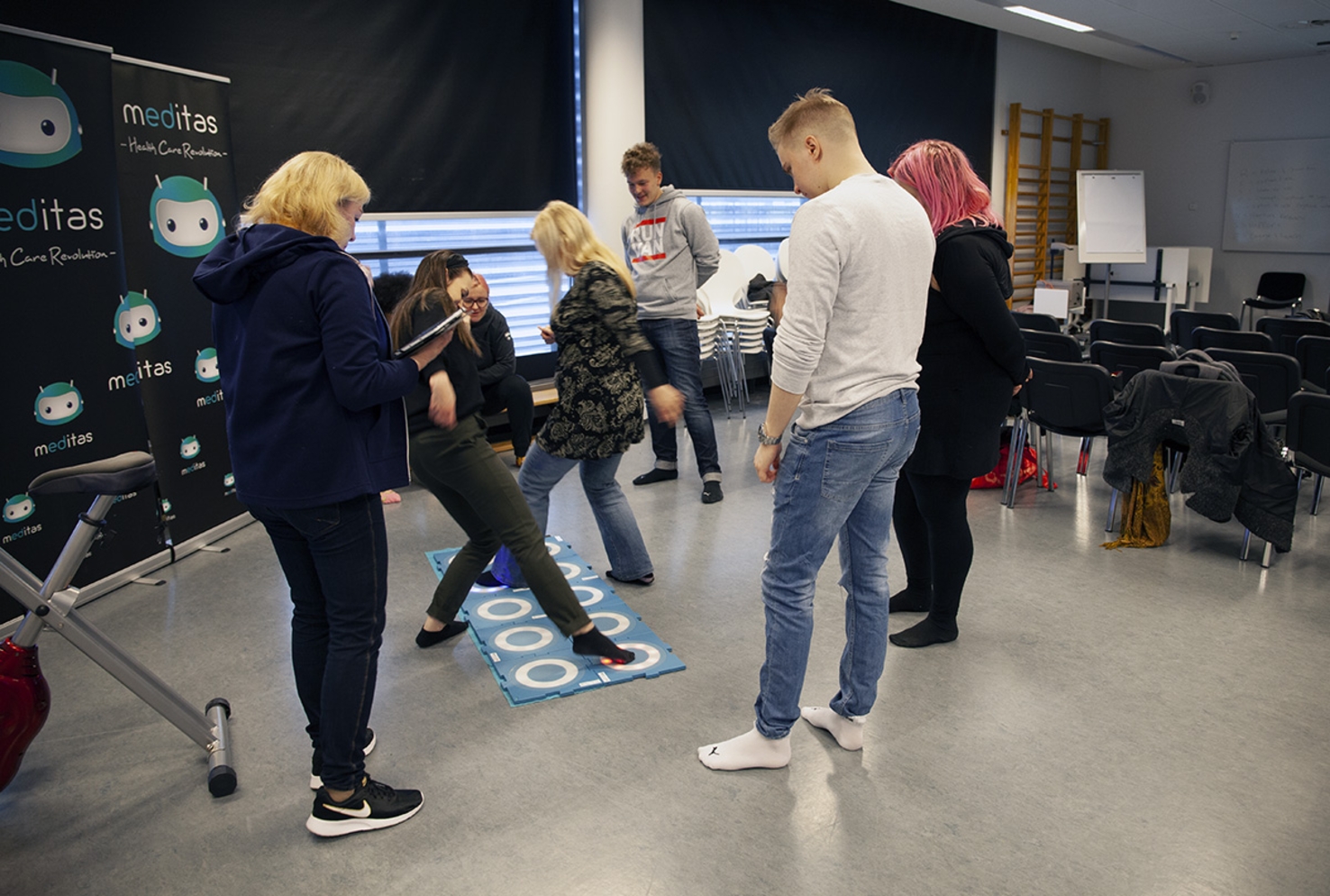 Tikkurilan kampuksen sosionomiopiskelijat pääsivät mittaamaan omaa toimintakykyään ja tutustumaan hyvinvointiteknologiaan fysioterapeuttiopiskelijoiden ja teknologiayritysten johdattelemana.