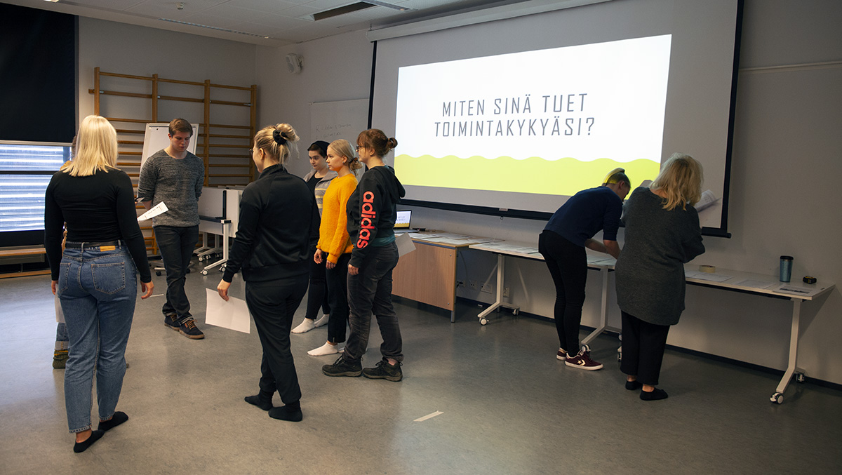 Luento-osuuden jälkeen sosionomiopiskelijat pääsivät mittaamaan omaa toimintakykyään muun muassa puristusvoima-, tuolilta nousu- ja kävelytesteillä. Teknologialainaamon tuotteista opiskelijoiden testattavana olivat BungyPump-kuntoilusauvat sekä Taikofon-äänituntumasoitin, jota voidaan käyttää esimerkiksi rauhoittumiseen stressaavissa tilanteissa. Lisäksi opiskelijat oppivat, miten jättikokoinen Yetitablet toimii ja miten sitä voidaan hyödyntää esimerkiksi keskittymishäiriöisten lasten opetuksessa, tai miten MotoTILES-liikuntalaatoilla voidaan edistää vanhusten liikkuvuutta. Testattavana oli myös Memoride-kuntopyörä, jonka avulla käyttäjän on kuntoilun ohessa mahdollista palata virtuaalisesti lapsuutensa maisemiin.