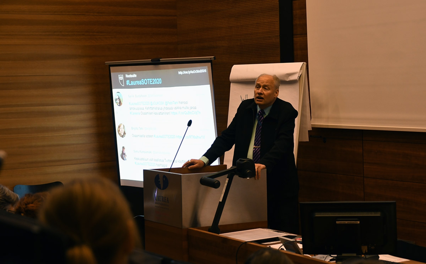 Rehtorin puheenvuoron jälkeen ääneen pääsivät opetusneuvos Sanna Hirsivaara opetus- ja kulttuuriministeriöstä sekä sosiaalineuvos Juha Luomala sosiaali- ja terveysministeriöstä, jotka kertoivat hankkeen tilanteesta ja tavoitteista. Hirsivaara pohti esityksessään erityisesti uusia osaamistarpeita, joita syntyy sosiaali- ja terveydenhuollon rakenteen ja palvelujen uudistamisesta sekä esitteli osaamisen kehittämisen rakenteita. Luomala pohjusti esitystään kertomalla sote-uudistuksen kulmakivistä ja listasi hankkeen aikana tunnistettuja haasteita, jotka liittyivät muun muassa ammattien väliseen yhteistyöhön ja sen johtamiseen.
