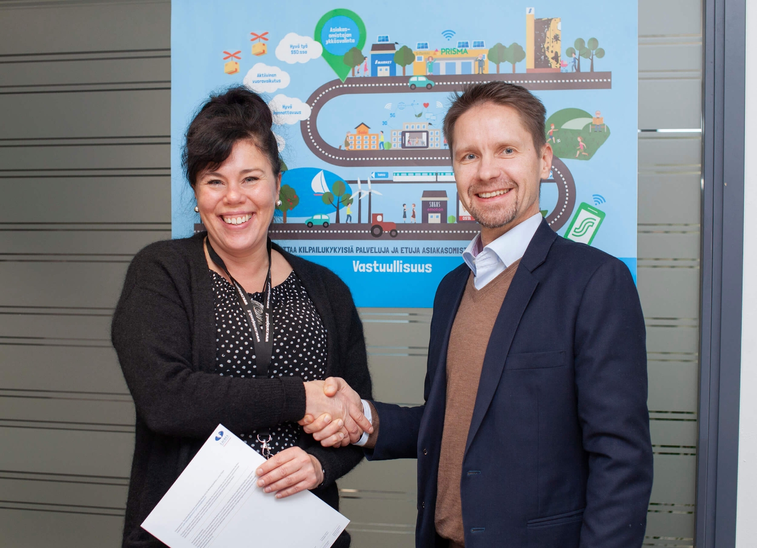 Laurean rehtori, toimitusjohtaja Jouni Koski kiittää Suur-Seudun Osuuskauppa SSO:ta lahjoituksesta Laurean opiskelijoiden hyväksi. Samalla hän odottaa jo Lohjalle kesällä 2019 valmistuvaa uutta kampusta, joka sijoittuu SSO:n rakennuttamaan Kauppakeskus Loheen: