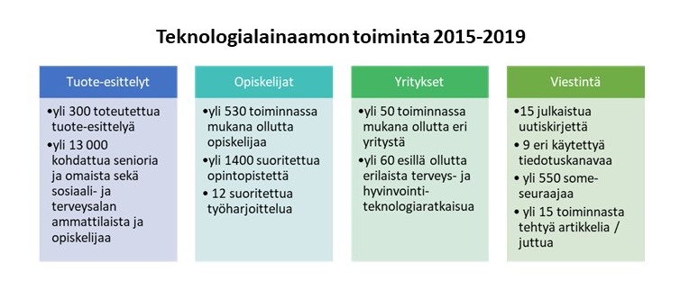 Toiminta päättyy toukokuun 2019 lopussa. Kuluneet vuodet ovat olleet antoisia ja opettaneet paljon. Olemme toiminnassa kohdanneet paljon hyvinvointi- ja terveysteknologiasta kiinnostuneita ikääntyneitä, heidän omaisiaan sekä sosiaali- ja terveysalan ammattilaisia ja opiskelijoita.