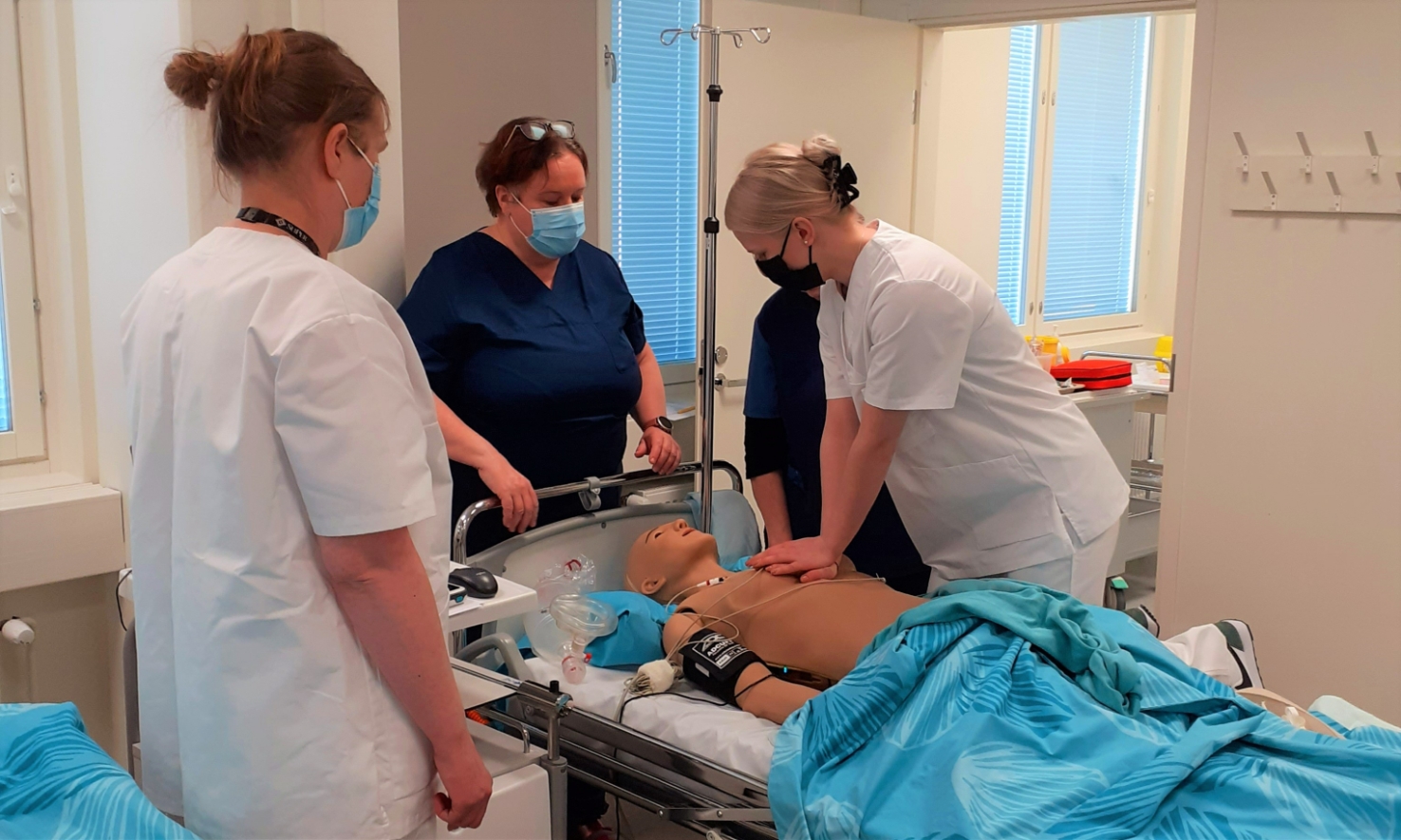 Careerian lähihoitajaopiskelijat ja Laurean sairaanhoitajaopiskelijat suorittivat yhdessä simulaatioympäristössä hoitoelvytys-opintokokonaisuuden. Valmistautumiseen kuului teoriaopintoja sekä osallistuminen Laurean hoitoelvytys-verkkokurssiin yhdessä sairaanhoitajaopiskelijoiden kanssa. Simulaatioympäristössä 19.–21.4.2022 työskenneltiin erilaisissa asiakastilanteissa, joissa opiskelijat saivat harjoitella hoitoelvytystä SimAnne-nukkesimulaattorin avulla moniammatillisessa työryhmässä.