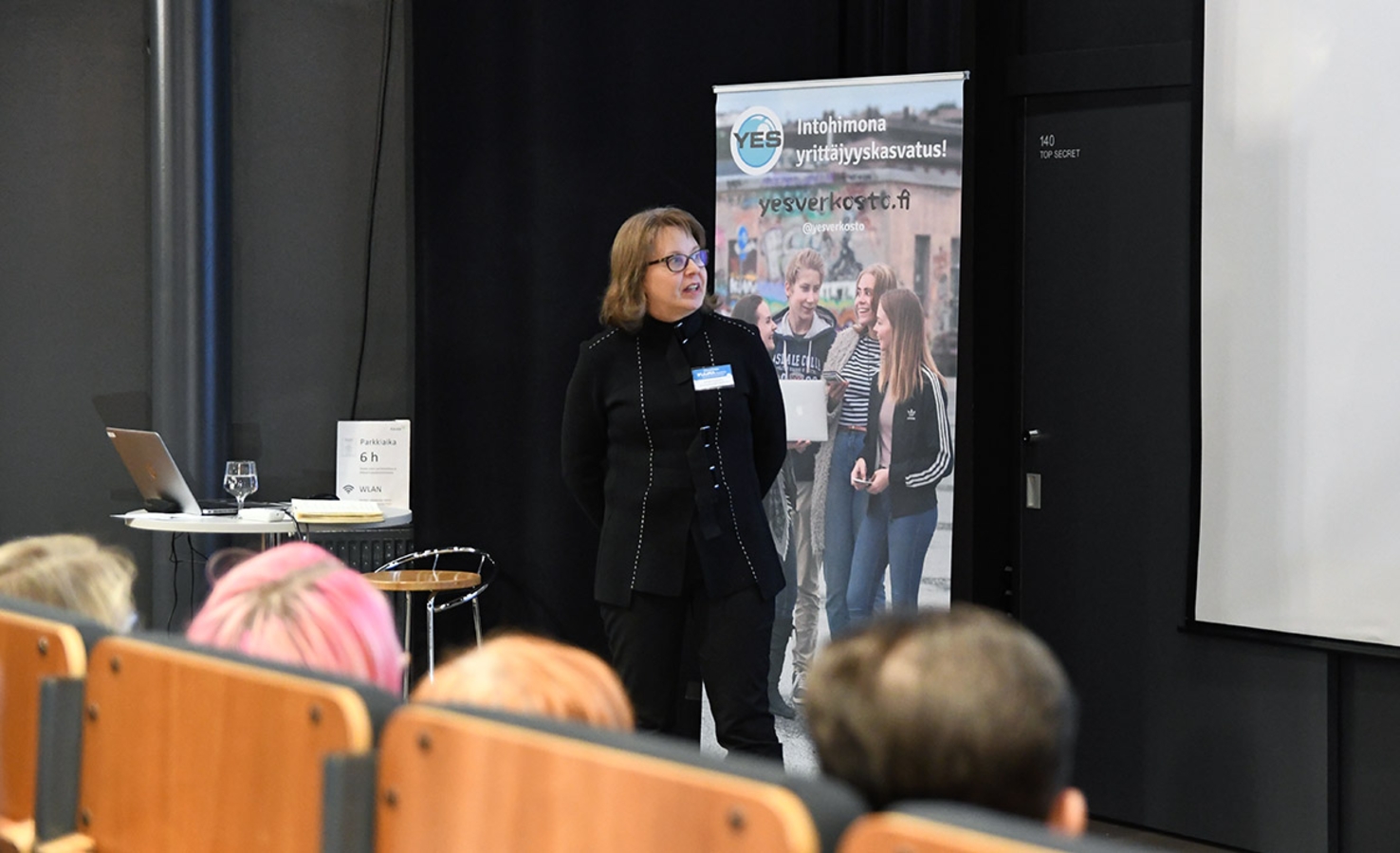 YES Keski-Uusimaan aluepäällikkö ja Keudan projektipäällikkö Birgit Eskelinen esitteli yrittäjyyskasvatuspolkua, jonka avulla yrittäjyys saadaan osaksi opetusta mahdollisimman varhain. Paikalla oli myös eri oppiasteiden koululaisia ja opiskelijoita opettajineen, jotka kertoivat kokemuksiaan yrittäjyyskasvatuksen toteuttamisesta.