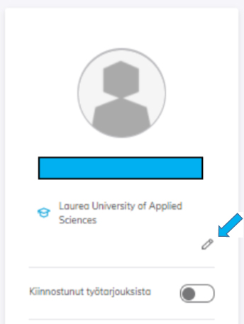 Profiilikuvan alla olevaa kynää klikkaamalla saat auki yhteenveto-sivun, jossa pääset muokkamaan koulutusalatietojasi. Nähdäksesi valmistuneille opiskelijoille eli alumneille tarkoitetut palvelut, tulee sinun valita koulutusalaksi: Alumni (FIN).
