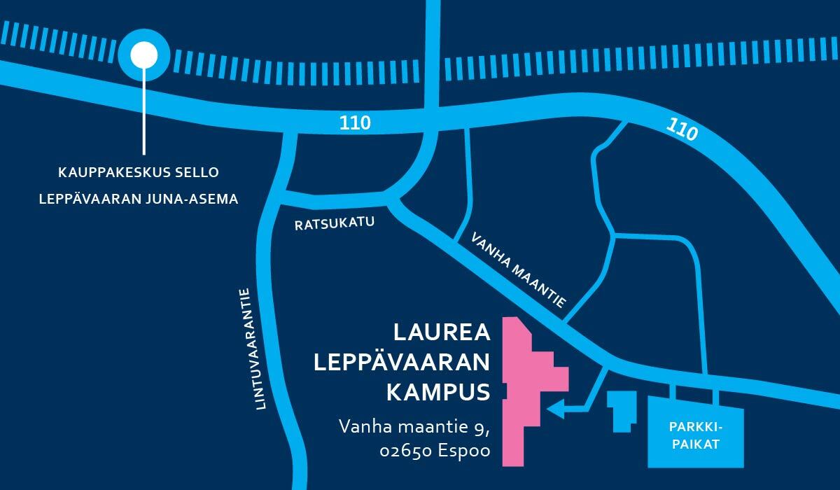 Laurean Leppävaaran kampus sijaitsee hyvien kulkuyhteyksien päässä Espoossa (Vanha maantie 9, 02650 Espoo). Paikan päälle voi saapua helposti julkisilla sekä omalla autolla. Julkisista kulkuvälineistä Leppävaaran kampukselle pääsee helpoiten lähijunalla. Autolla saapuville parkkipaikkoja löytyy Kelloseppäkoulun takaa.
