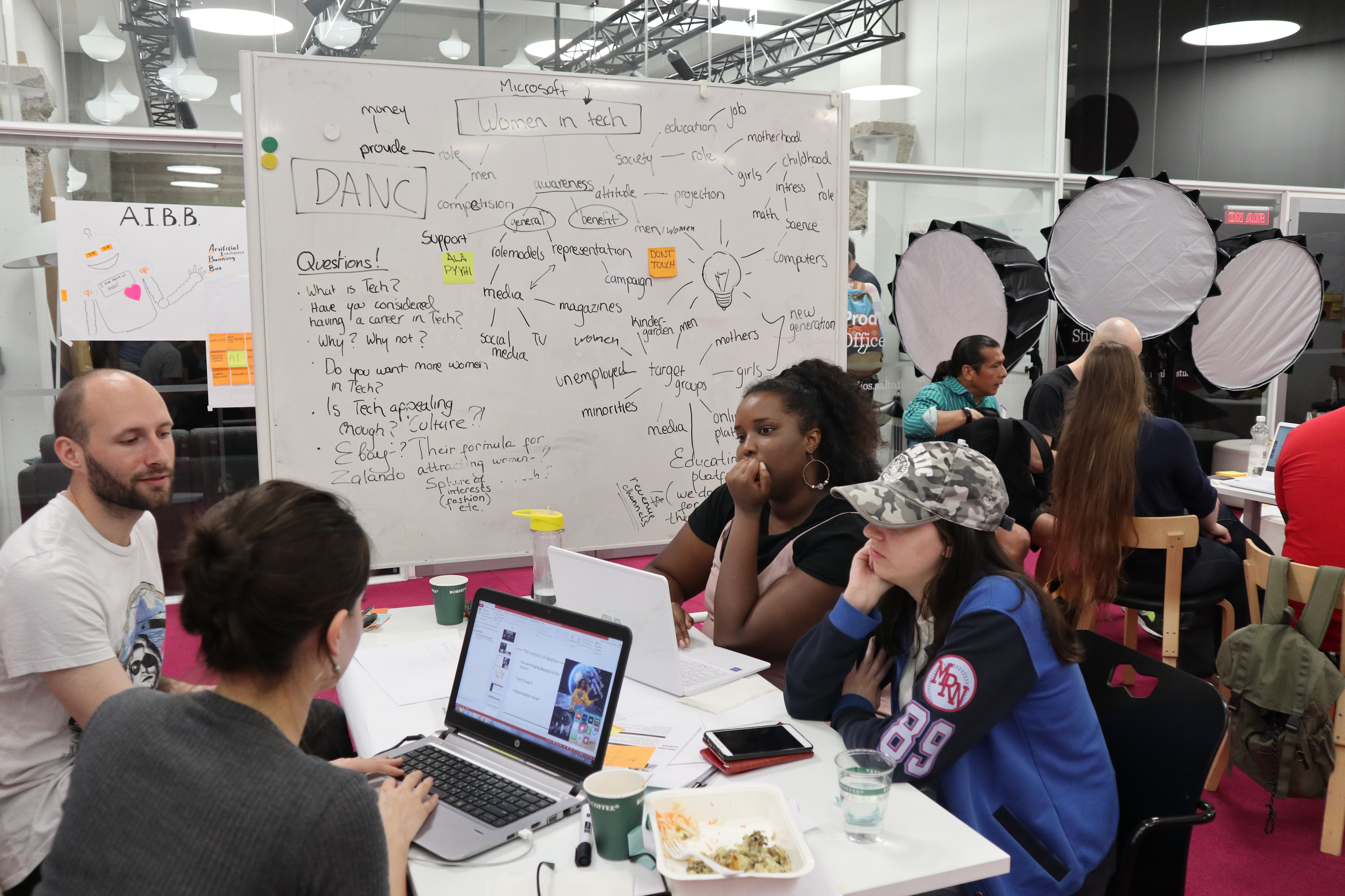 Four teams chose Women in Tech challenge. Each one approached the topic from a different angle. One idea was to build an educational space in different formats, like a game for girls, or wine and coding evenings for women. Another concept was about introducing technology, coding, AI into non-tech jobs done by women, like nursing and different services. One of the teams wanted to incorporate Women in Tech into a LUX Helsinki art event. This is a light art exhibition in downtown Helsinki. Each piece of light art is also tech, including coding. Some done by women. Hence, the idea was to make a “behind the scene” exhibition next to the art piece, telling how the tech-art was done.