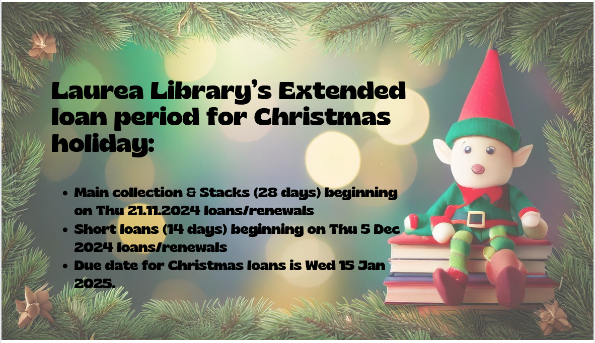 Laurea Libraries Hyvinkää, Leppävaara, Otaniemi, Porvoo and Tikkurila are closed from Thu 19 Dec 2024. The Lohja Library will be open for self-service until Friday, December 20th. You can check more detailed information on our website.