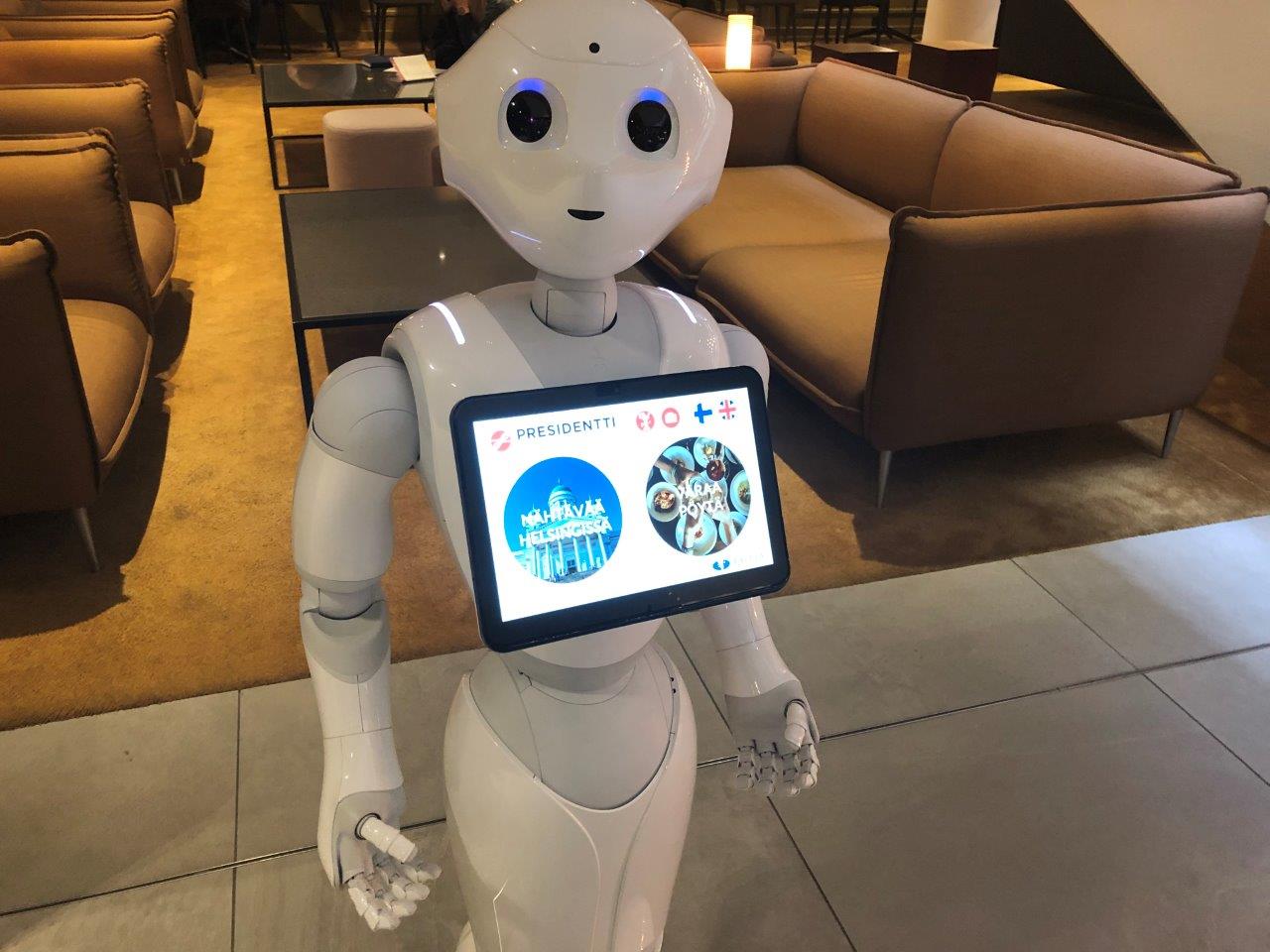 Student project. A humanoid robot Pepper, developed by SoftBank Robotics and programmed by Laurea’s students, entertained guests in Sokos Hotel Presidentti in Helsinki.