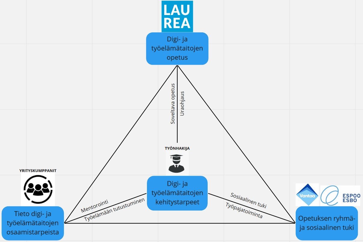 Tiimi kehittää ratkaisua Laurean tarjoaman palvelumuotoilu-, työelämä- ja digiopetuksen siivittämänä keväällä 2021. Yritys ohjaa kehitystehtävän edistymistä yhdessä Laurean palvelumuotoiluopettajan ja kaupunkien ryhmämentorien kanssa.