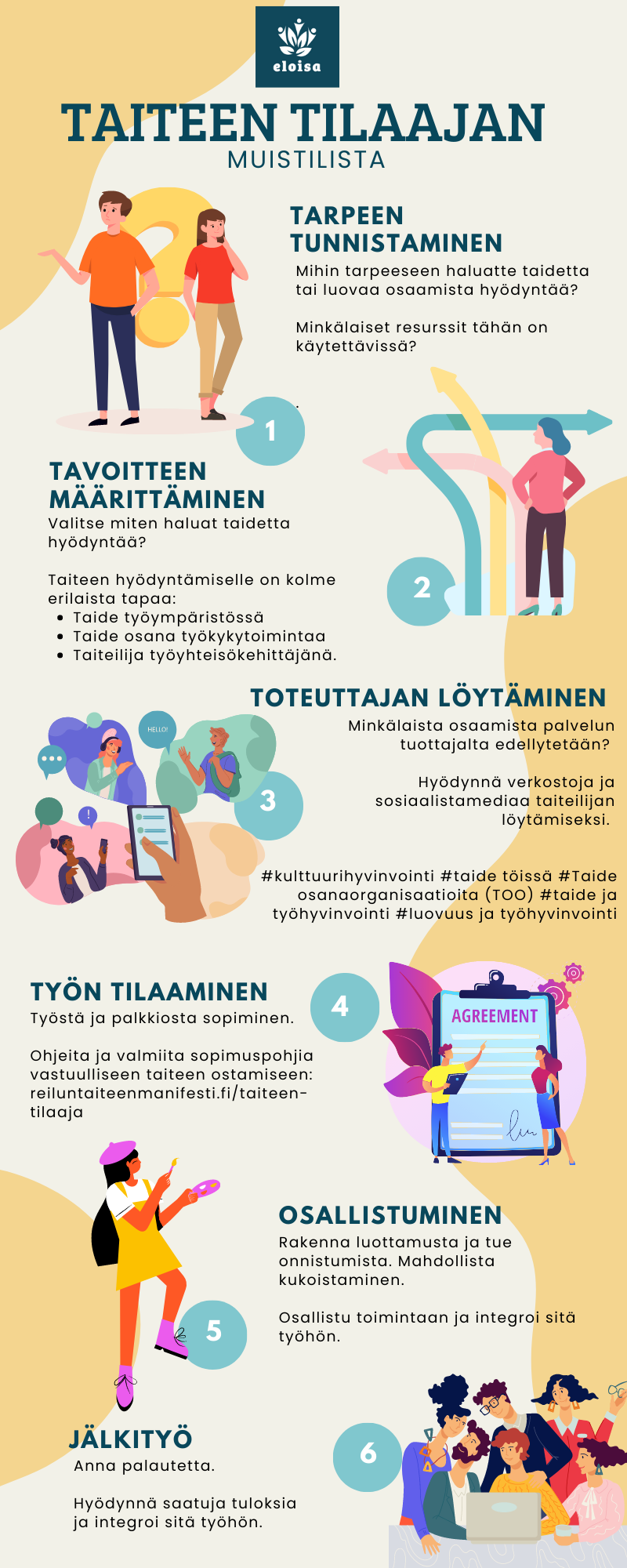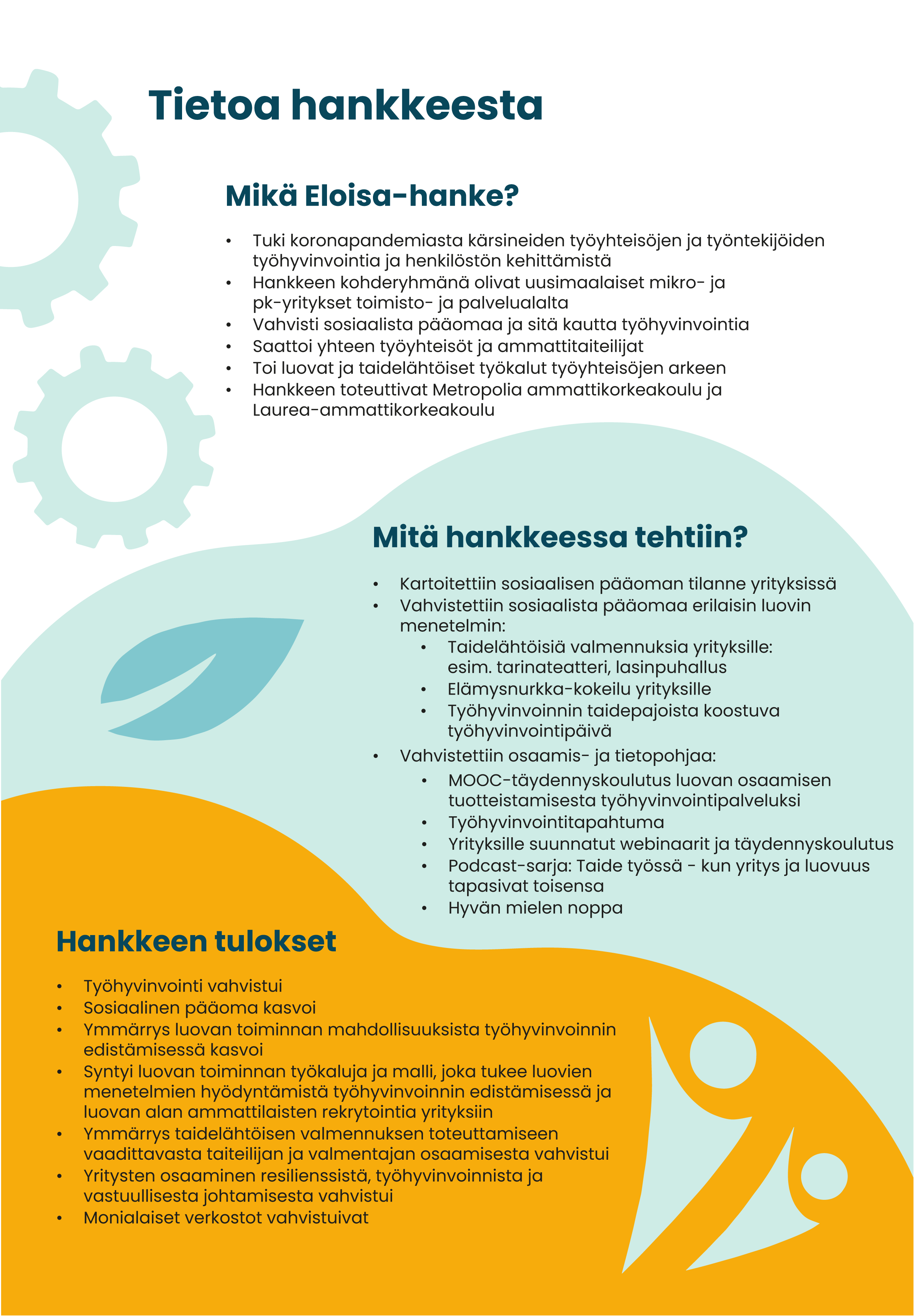 ELOISA-hanke tuki COVID 19-pandemiasta kärsineiden työyhteisöjen ja työntekijöiden työhyvinvointia sekä henkilöstön kehittämistä tuomalla luovia ja taidelähtöisiä työkaluja yritysten ja heidän työntekijöiden arkeen. ELOISAssa kohtasivat ammattitaiteilija / luovan alan ammatinharjoittaja, opiskelijat sekä yrityksien työntekijät. Interventiot mahdollistivat taiteen hyödyntämisen suunnittelun ja taidetoiminnan käynnistämisen organisaatioissa. Hankkeen kohderyhmänä olivat uusmaalaiset mikro- ja pk-yritykset toimisto-, sote- ja palvelualalta. Päätoteuttajana toimi Metropolia Ammattikorkeakoulu ja osatoteuttajana Laurea-ammattikorkeakoulu. Hanketta rahoitti Euroopan sosiaalirahasto.