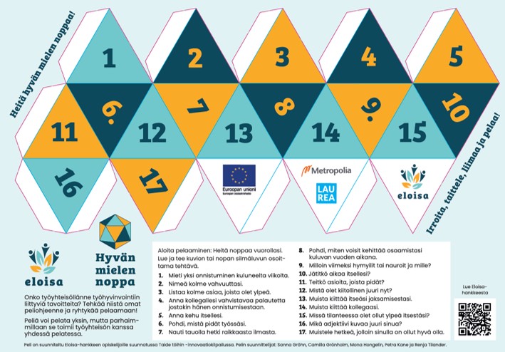 Voit ladata Hyvän mielen nopan tästä.Ennen nopan käyttämistä on tiedossa sorminäppäryyttä harjoittava vaihe, sillä noppa pitää itse taitella ja teipata tai liimata kokoon. Oheisen PDF-muodossa olevan nopan voi tulostaa vähän vahvemmalle paperille tai ohuelle kartongille, jolloin nopasta saa vahvemman. Kartongille painettuja noppia on ollut jaossa Eloisa-hankkeen päätöstapahtumassa sekä Laurean muiden hankkeiden yritysvierailuilla.