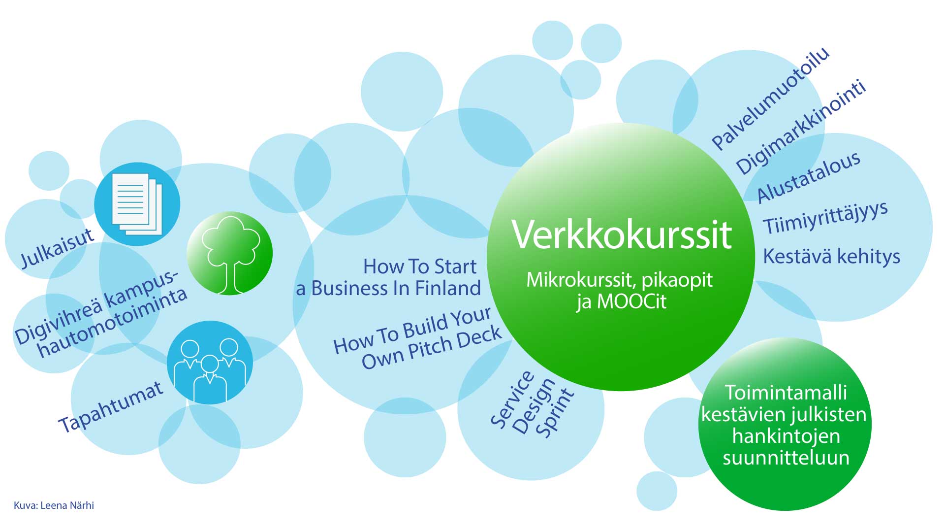 Hankkeessa tuettiin Uudenmaan alueen yrittäjiä ja yrittäjiksi aikovia tarjoamalla heille lyhyitä ja maksuttomia verkossa avoimesti tarjolla olevia mikrokursseja, pikaoppeja ja MOOC-kursseja. Kurssit olivat joustavia ja personoituja tapoja kehittää ja päivittää omaa osaamista. Kurssit antoivat valmiuksia kehittää yrityksen toimintaa digitalisaation ja kestävän kehityksen näkökulmista. Kurssista sai mm. käytännön vinkkejä yrityksen kehittämiseen sekä liiketoiminnan vahvistamiseen kestävällä tavalla.