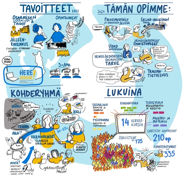 Here Ukraine! -hanke käynnistyi nopealla aikataululla Ukrainan tilanteen kriisiydyttyä vuonna 2022. Hankkeen alussa projektitiimi, lehtorit, suunnittelijat ja asiantuntijat joutuivat toimimaan osin oletuksin, osin vaillinaisin tiedoin ja ennen kaikkea tietoa hakien ja oppien. Hankkeen aikana ymmärrettiin mm., kuinka paljon korkeakouluissa tarvitaan selko-ohjeita opintojaksoille ilmoittautumista, osallistumista ja itsenäistä opiskelua tukemaan. Opimme myös, kuinka tärkeää henkilökohtainen ohjaus ja motivointi, mutta myös yhteisöllisyys opintojen aikana on. Merkittävää on suunnitella opinnot sensitiivisesti ja traumatietoisesti: yksilön rajallista jaksamista tukien. Täysin automatisoitu toteutustapa ei välttämättä ole paras opiskelumuoto yksilön näkökulmasta, vaikka se korkeakoulujen näkökulmasta mahdollistaa suuren osallistujavolyymin. Yksi iso oppi liittyi hankkeen suunnittelun systematisointiin: kohderyhmä ja palvelumuotoilu on tärkeä ottaa mukaan hankkeen käynnistymisen ja suunnitelman konkretisoimisen vaiheessa, jolloin korkeakoulujen ja yksilöiden tavoitteet tuodaan yhteen.