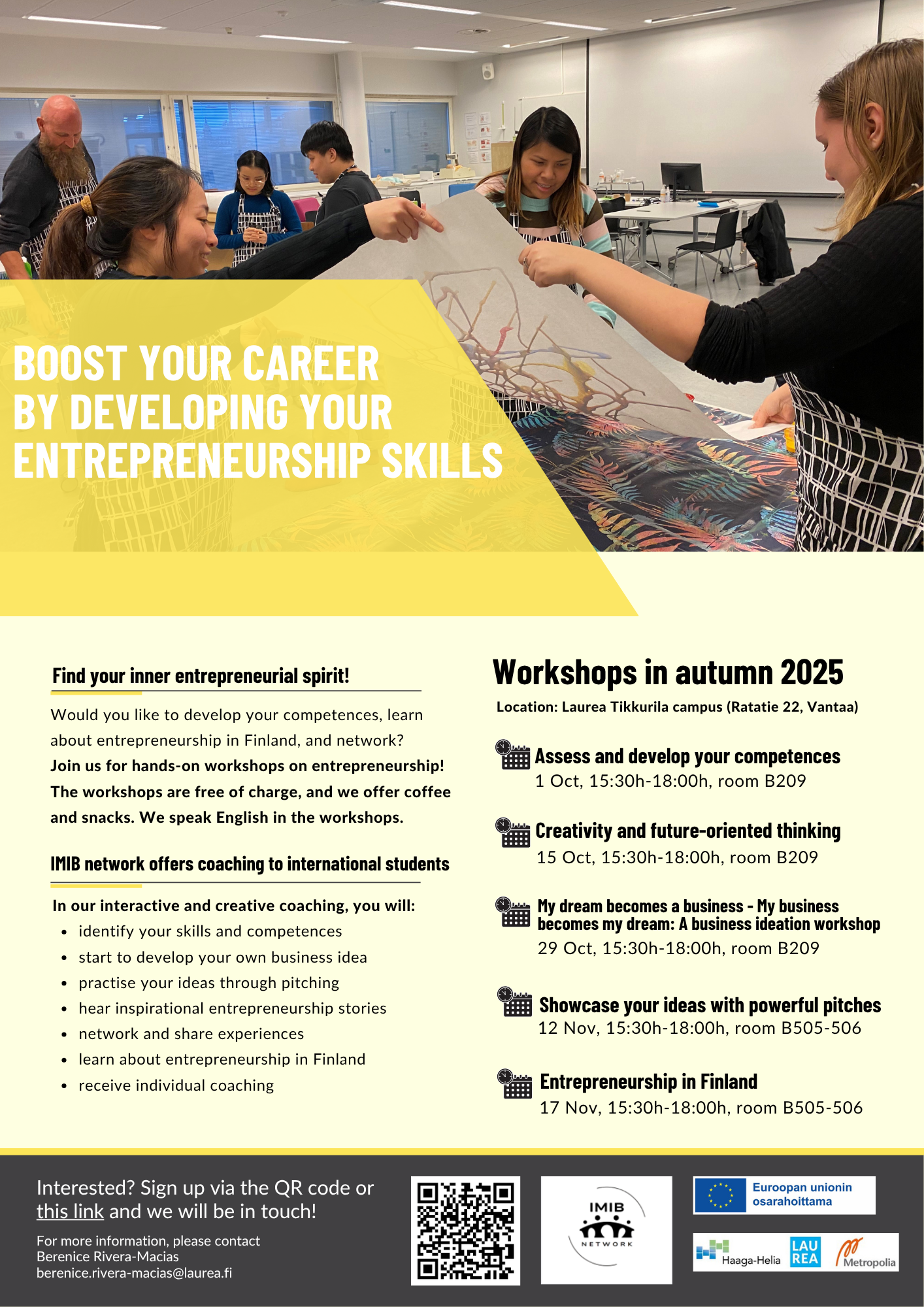 - Yrittäjyyspolun luovia ja vuorovaikutteisia menetelmiä hyödyntävät työpajat vahvistavat osallistujien valmiuksia yrittäjyyteen, joka on kansainvälisille osaajille myös merkittävä työllistymisen muoto Suomessa. Lisäksi yrittäjämäisen asenteen vahvistaminen auttaa kehittämään myös muita uramahdollisuuksia. Voit ilmoittautua yrittäjyystyöpajoihin tämän linkin kautta.