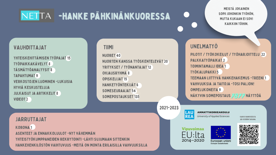 NETTA – Erityistä tukea tarvitsevan nuoren työllisyyden ja osaamisen tuki -hankkeessa kehitettiin vuosina 2021–2023 toimintamallia ja keinoja siihen, kuinka työnhakijan ja -tekijän vahvuudet ja osaaminen saadaan parhaalla mahdollisella tavalla kohtaamaan työnantajien rekrytointitarpeet. Hankkeen ensisijainen kohderyhmä olivat erityistä tukea tarvitsevat nuoret ja aikuiset työelämän poluillaan sekä työnantajat, jotka tarvitsevat sitoutuneita työntekijöitä.