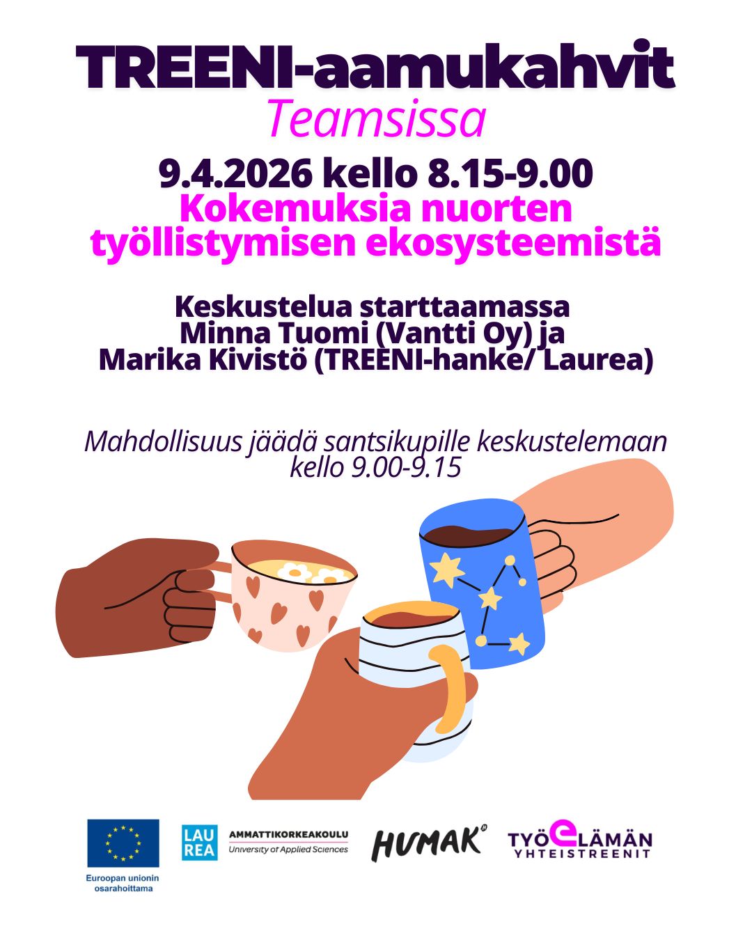 TREENI- Työelämän yhteistreenit -hankkeessa kehitetään valmentavalla sosiaalipedagogisella työotteella ratkaisuja nuorten työnhakijoiden ja työelämän kohtaanto-ongelmiin sekä työyhteisöjen moninaisuuden tukemiseen. Pyrkimyksenä on edistää nuorten hyvää elämää työelämään sijoittumisen ja osallisuuden kautta sekä vaikuttaa yhteiskuntaan lisäämällä moninaisuuden ja yhdenvertaisuuden ymmärrystä työyhteisöissä.