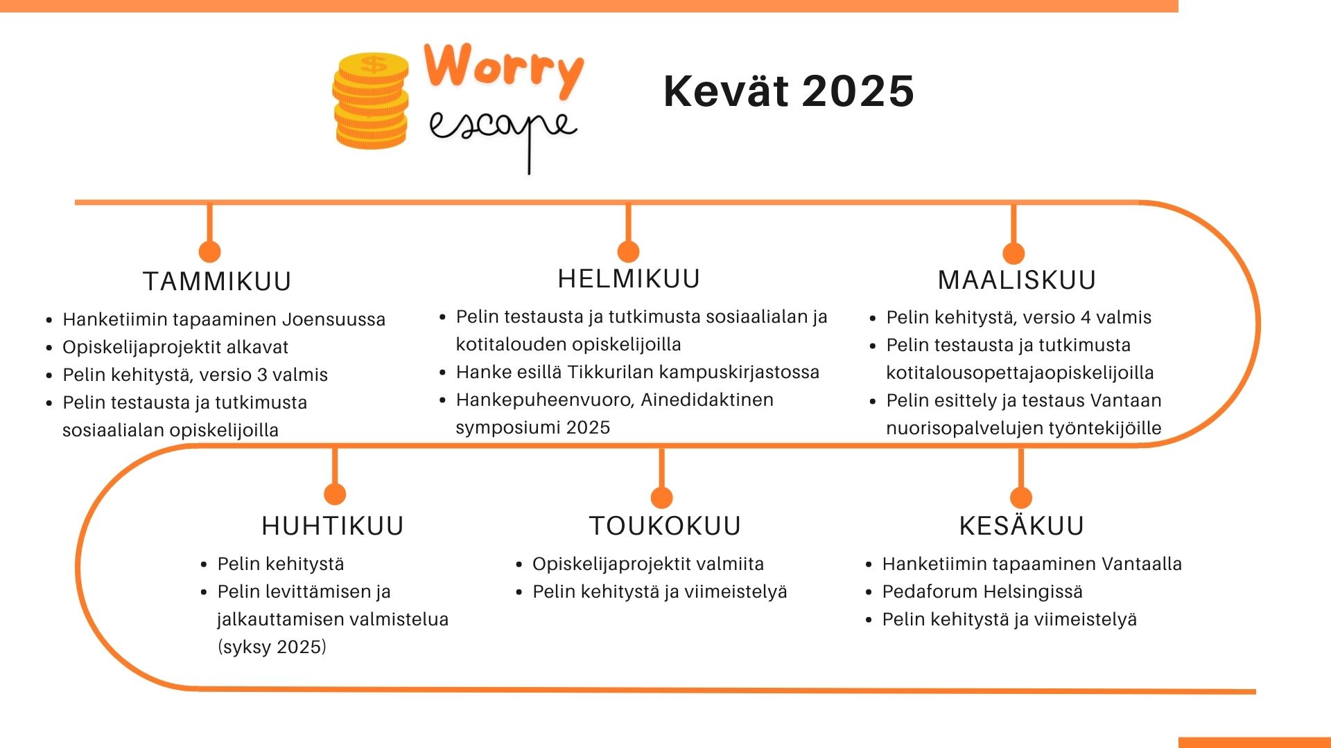 - Tutkimusvaihe (10/24-9/25) kulkee pilotointivaiheen rinnalla. Tutkimusaineisto kerätään osallistuvilta kohderyhmäopiskelijoilta heidän suunnitellessa ja pelatessa talouspakopeliä.