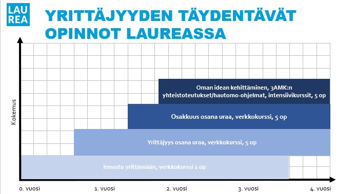 Yllä oleva kuvio havainnollistaa yrittäjyyden eri muodot ja visualisoi Laurean yrittäjyyskasvatuksen painopistealueen. Yrittäjyysopintojen suhteen Laurea haluaa tarjota jokaiselle opiskelijalle riittävän perusymmärryksen tulevaisuuden työelämän yrittäjämäisestä luonteesta ja kyvykkyyden siinä selviytyäkseen. Yrittäjyyden perusymmärryksen hankittuaan opiskelija voi edetä haasteellisempiinkin yrittäjyyden muotoihin, kuten myyntiagenttiyrittäjyys, omistajavaihdosyrittäjyys tai startup-yrittäjyys. Yhtenä erottavana tekijänä toimii osaomistajuuteen keskittyminen ja kyseisen dynamiikan ymmärtäminen perinteisessä-, startup- ja buyout-yrityksissä erikseen.