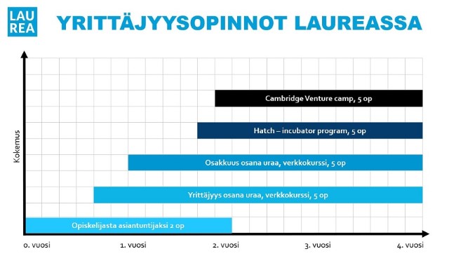 Yrittäjyys on Laurean yksi strateginen painopistealue. Tästä syystä jokainen opiskelija - taustasta tai opintosuunnasta riippumatta - pyritään altistamaan yrittäjyyden pariin.
