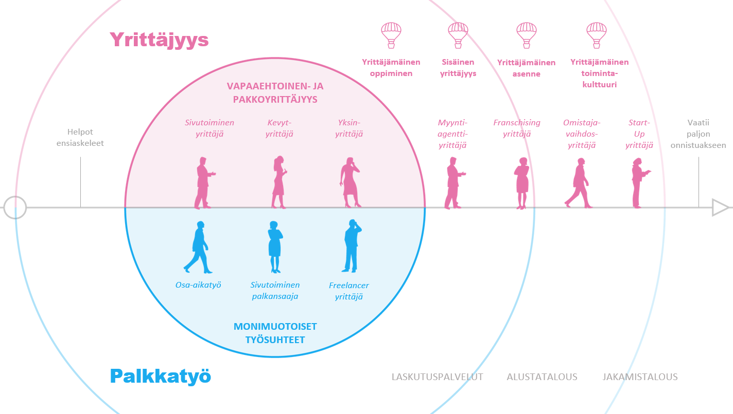 Tulevaisuuden yrittäjä ja palkansaaja toimivat useassa eri roolissa yhtäaikaisesti ja toteuttaa itseään aiempaa monipuolisemmin. Yrittäjyys ja palkkatyö lähestyvät toisiaan ja niiden välimaastoon sijoittuville työn muodoille on entistä enemmän kysyntää. Jatkossa palkansaajatyötä ja yrittäjätyötä tehdään peräkkäisinä ja päällekkäisinä jaksoina. Päätoiminen palkansaaja voi olla sivutoiminen yrittäjä – ja päinvastoin. Palkkatyötä, osinkotuloa, tai laskutusta vastaan tehtyä työtä voi olla vaikea erotella päätyöksi ja sivutyöksi, sillä henkilö saattaa kokea ne samanarvoisiksi.