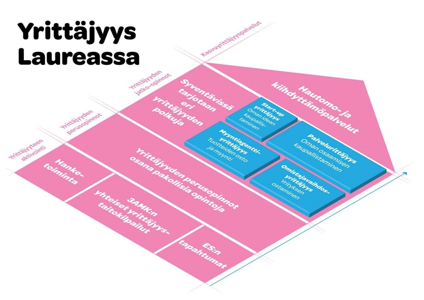 Yllä oleva kuvio havainnollistaa yrittäjyyden eri muodot ja visualisoi Laurean yrittäjyyskasvatuksen painopistealueen. Yrittäjyysopintojen suhteen Laurea haluaa tarjota jokaiselle opiskelijalle riittävän perusymmärryksen tulevaisuuden työelämän yrittäjämäisestä luonteesta ja kyvykkyyden siinä selviytyäkseen. Yrittäjyyden perusymmärryksen hankittuaan opiskelija voi edetä haasteellisempiinkin yrittäjyyden muotoihin, kuten myyntiagenttiyrittäjyys, omistajavaihdosyrittäjyys tai startup-yrittäjyys. Yhtenä erottavana tekijänä toimii osaomistajuuteen keskittyminen ja kyseisen dynamiikan ymmärtäminen perinteisessä-, startup- ja buyout-yrityksissä erikseen.