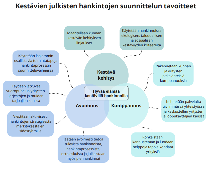 Mallin päätavoite on "Hyvää elämää kestävillä hankinnoilla". Päätavoite sisältää kolme osa-aluetta: