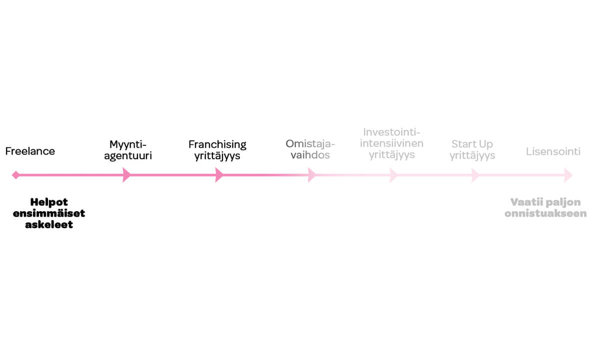 Muutoksen ilmentymiä ovat monenlaiset pätkä- ja projektityöt, joiden tarjonta toteutuu mm. alustatalouden kautta. Maailmalla itsensä työllistämisestä on tullut arkipäivää, moni ei edes tavoittele pitkäkestoisia työsuhteita tai tee vain yhtä työtä samaan aikaan. Tulevaisuudessa tämän ilmiön odotetaan voimistuvan. On ennustettu, että 2030-luvulla 60 prosenttia suomalaisesta työvoimasta toimii yrittäjinä tai freelancereina. Pärjätäkseen jokaisen meistä tulisi ymmärtää yrittäjyyden perusteet. Vähintäänkin osata hinnoitella ja kaupallistaa oma osaaminen – ja toimia oman itsensä johtajana hyvinvointia ja työssä jaksamista unohtamatta.