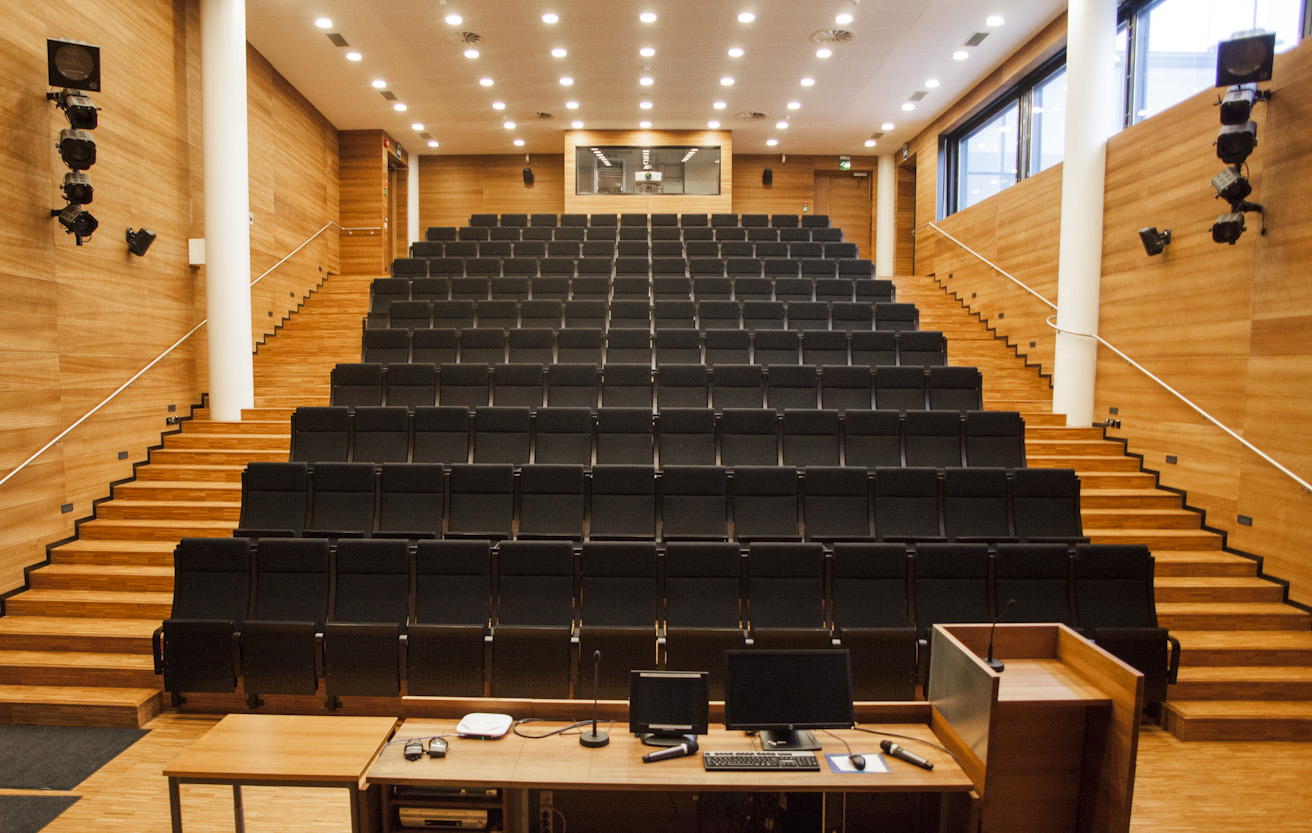 Otaniemen pääauditorio, jossa on nouseva katsomo ja pehmustetut penkit. Kapasiteetti on 232 henkilöä. Tila soveltuu hyvin myös liikuntaesteisille.
